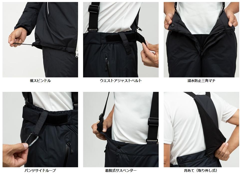 メイン生地には透湿性と防水性を両立するレインマックス(R)ハイパー素材を使用。 磯場での使用を想定し、厚みのある生地を使用。 冬の厳しい寒さに対抗するハイロフトウィンタースーツ。通常の1.5倍に相当する大盛中綿でしっかり温かい。さらに腰からの冷気や水の浸入を防ぐため、パンツは背あてつき。(着脱可)