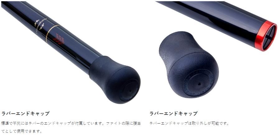 竿尻には、振込の際握り込みやすく、魚とのやりとりではしっかり腹当てできるラバーエンドキャップを標準装備しています。