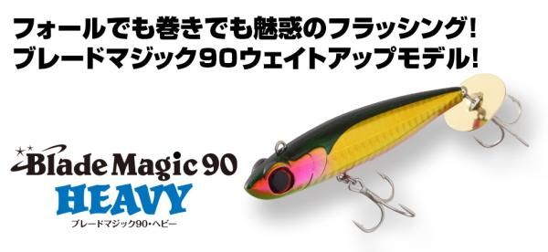フィッシュイーターを翻弄し続けているブレードマジック90のヘビーウェイトモデル。シルエットはそのままにウェイトを35gまで上げることで飛距離アップを実現。アクションはロール主体のウォブンロールだがオリジナルよりもウォブリング比率を若干大きく設定、魚のコンディションに合わせた使い分けが可能です。同速で巻くと一段下のレンジを泳ぐので、レンジを下げたい時にも適しています。着水後のフリーフォールではブレードが水を掴み、フラッシングしながらターゲットレンジまで潜るので、フォール中にもバイトが多発。ターゲットレンジ到達後は低速から高速まで幅広いリトリーブ速度に対応します。