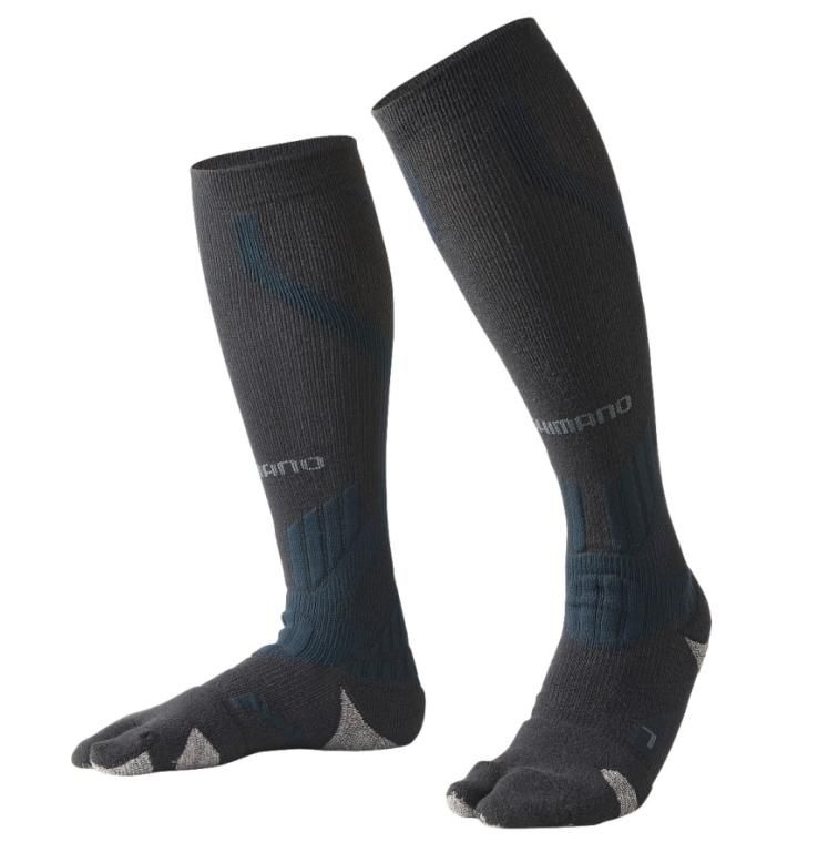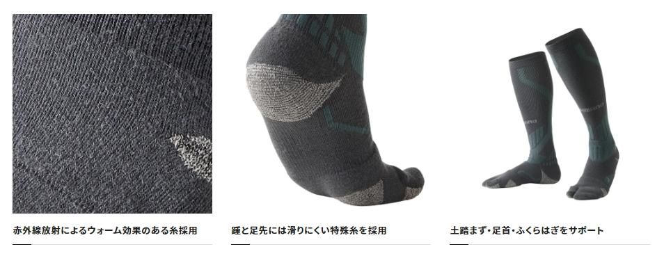 赤外線放射によるウォーム効果のある糸を採用。足首のサポート、ふくらはぎの段階着圧、土踏まずのアーチサポート、靴内での滑りを軽減する特殊糸を拇指球に採用するなど、暖かさに加え長時間履きやすく疲れにくい設計を追求。また、従来のモデルと比べて着脱のしやすさも向上。冬の厳しい寒さと戦うアングラーをサポートする、中割れタイプの高機能保温ソックスです。
