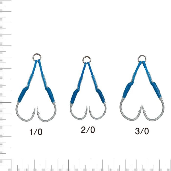 ショアジギングシーンにおいて、バイトがあったにも関わらずフッキングに至らない原因の一つがフックのジグ絡み。貴重なワンチャンスを逃さないために、どうすればジグ絡みを抑えることができるのか?を追求した結果、長すぎず短すぎない絶妙な寸法で、アシストラインにチューブを被せる加工を施しました。そうすることでフックに高い自由度を持たせながらも、ジグへの絡みを抑えるアシストフックが完成しました。ショアでのメジロ、ワラサなど中型回遊魚を中心に不意のブリクラスにも対峙可能なフックを採用しています。
