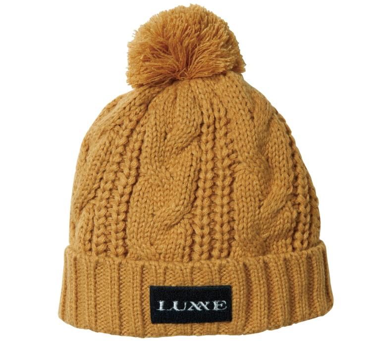 ・ローゲージのケーブル編みにポンポンをあしらった温かみのあるニットキャップ。