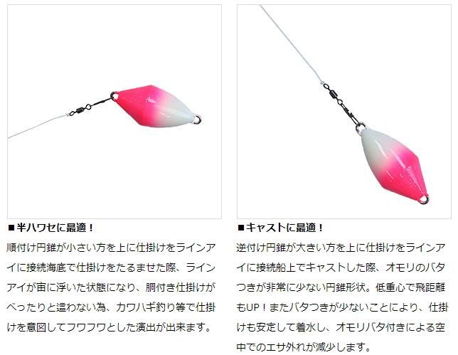 船上でキャストした際、オモリのバタつきが非常に少ない円錐形状。低重心で飛距離もUP!またバタつきが少ないことにより、仕掛けも安定して着水し、オモリバタ付きによる空中でのエサ外れが減少。