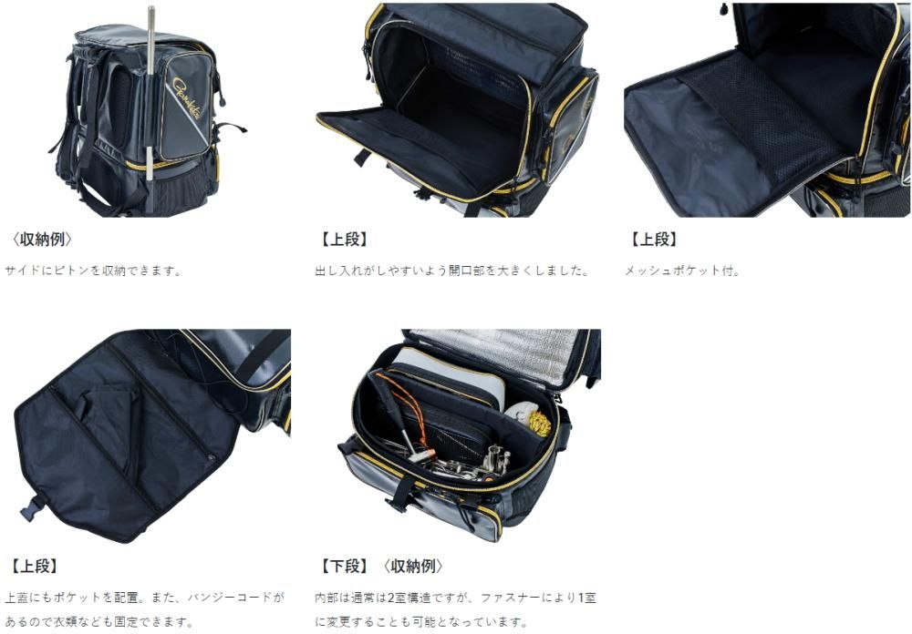 また、中蓋には衣類を固定できるバンジーコード、内部には、小分けや収納品の判別に便利なメッシュポケット設置するなど、小物の種類が多い底物釣りにベストマッチです。