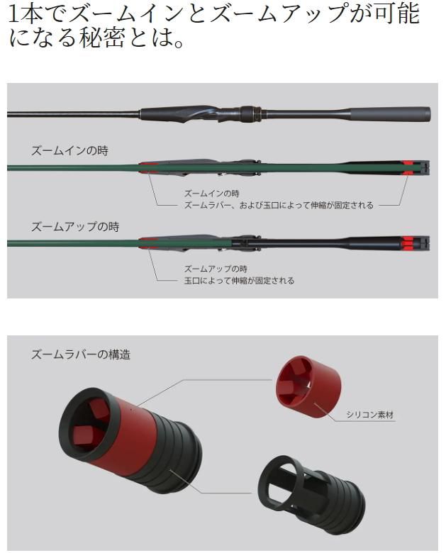 そのようなアングラーを悩ませる条件を1本のロッドで対応するために、独創的ズームロッドを開発。ズームインでショートレングスにした場合は、高精度キャストによる近〜中距離の攻略、足場の低いシーンなどで活躍。またルアーの操作性に優れ、身体への負担低減も特徴。
