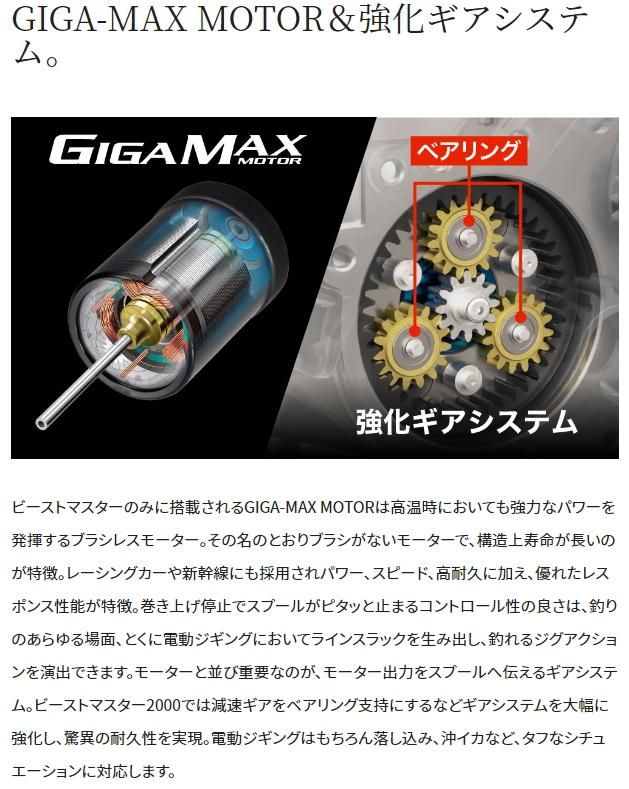 鋭くパワフルに巻き上げ、瞬時に止まる。ビーストマスターにのみ搭載されるブラシレスモーターGIGA-MAX MOTORはハイパワーかつハイスピード、高温に強く長寿命であると同時に、優れたレスポンスが特徴。