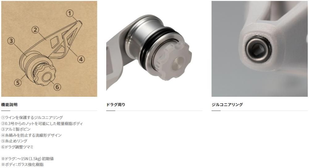 ■素材/本体・ツマミ:ガラス強化PBT樹脂、ボビン:アルミ、リング:ジルコニア、糸止めリング:ニトリルゴム