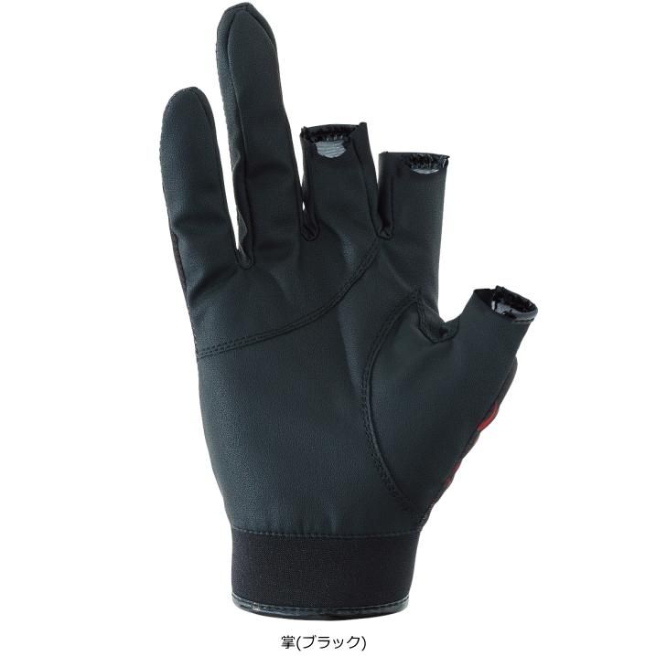縦横斜めの全方向にストレッチする伸縮性生地を甲側に配置することで、優れたフィット感が特徴のグローブ。“渋派手”の炎デザインをプリント加工にし、面ファスナー採用でさらに疲れにくさやフィット感にこだわりました。また、ロッドや撒き餌杓などを握りやすいように3本切の指部分(掌側)をカーブ状に設計しています。