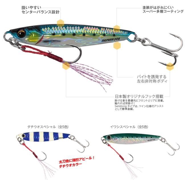 かねてから要望の多かった太刀魚が 好むパープル、グロー、ゼブラを基調とした「太刀魚カラー」とオールシーズンで使える「IWASHI系カラー5色」を ラインナップ。ジグパラ特有の艶めかしいスローフォールは、全てのフィッシュイーターに強烈にアピールします。