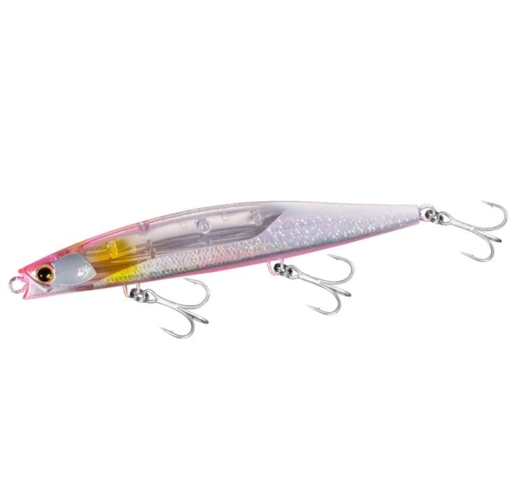シンキングペンシルのメリットは、遠くのポイントで表層をスローにアクションさせられること。メタルジグなどにはできない誘い方が可能です。そこでビームドリフトは、より遠くのポイントにルアーを届けられるよう、シンキングペンシルの中では重ための設計。遠投した先でもボトムタッチがわかりやすく、風の強い悪条件下でも遠投できるようにこだわりました。またアクションのバランスをとりつつ、空気抵抗を受けにくくしたデザインによってルアーが気持ちよく飛んでいきます。さらに先端のカップは掘りの深さや、長さ、角度などを細かく検証し、ルアーのアクションを向上させつつ、飛距離にも影響を与えないようなデザインを追求しています。