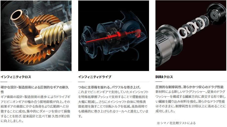 MGLシリーズの頂点としての軽量化、低慣性化、感度アップの追求はもちろん、インフィニティテクノロジーにより、抜けるようなキャストフィール、耐久性、巻きごこちとパワーを手に入れた。さらにライントラブルレス性能、ドラグの耐摩耗性能も大幅に向上。