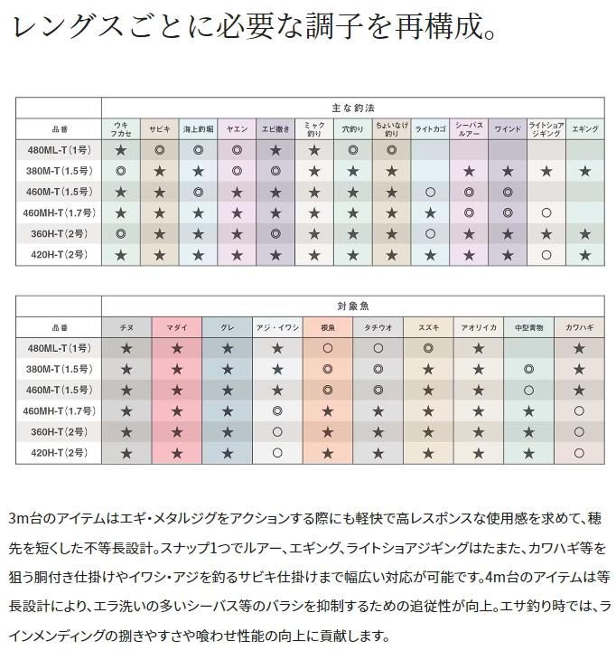 3m台はルアーのジャーク&アクション等、操作性を意識した、先軽・不等長設計。