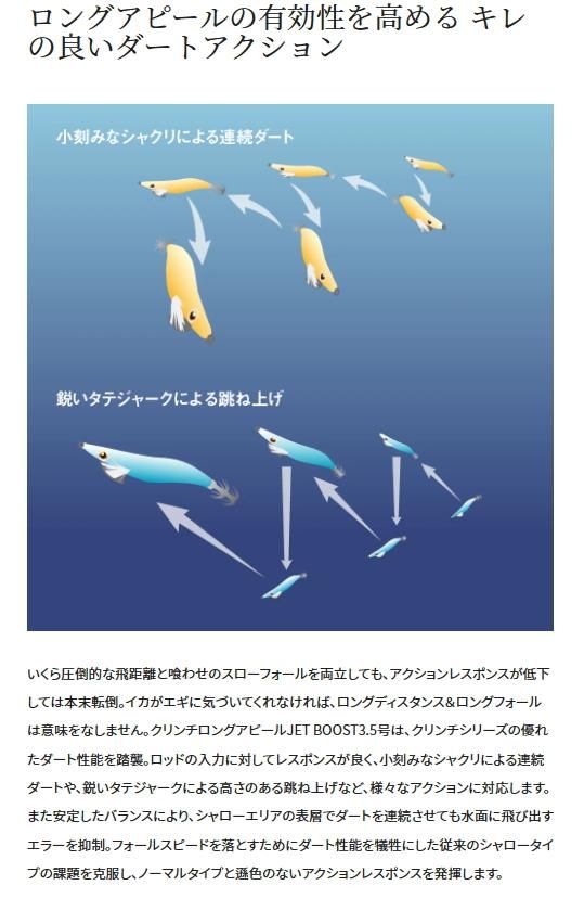 沈下速度が遅いシャロータイプのエギは、春の大型イカやスレイカに有効です。ただ、スローフォールさせるには重量を軽くするため飛距離が落ち、ダートアクションのキレの低下という弱点がうまれます。この問題を克服し、常識を覆すエギがクリンチロングアピールJET BOOST3.5号です。その名のとおり、重心移動システムのジェットブースト機構をシマノのエギに初搭載し、平均飛距離52mと圧倒的な遠投性能を発揮。沈下速度は約7.4秒/mと一般的なシャロータイプのエギより遅い喰わせのフォールを実現。距離的にも時間的にもロングアピールが可能で、しかもフラッシュブーストを搭載し、ロングフォール中もアオリイカを誘い続けます。規格外の飛距離とスローフォールを両立した新型エギが、警戒心の強い春の大型イカ狙いやスレイカ攻略の新たな扉を開きます。
