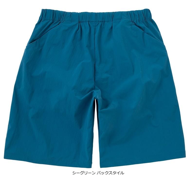 シワ感のある素材で、ドライタッチで汗をかいてもべた付きにくい。適度なストレッチ性で動きやすい生地を採用。撥水加工を施し、多少の水がかかるシーンでも快適に過ごせます。ウエストはスピンドル紐仕様。小物の収納に便利なファスナーポケット付き。