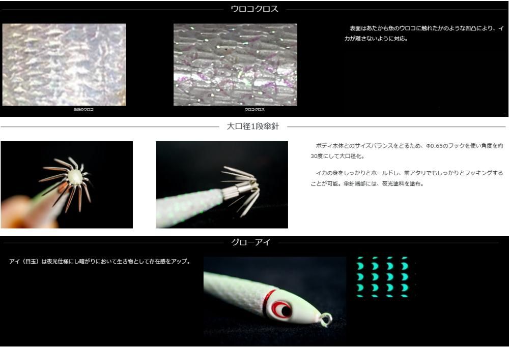 対象魚:スルメイカ(ムギイカ)、アカイカ(ムラサキイカ)、ケンサキイカ(マルイカ、ブドウイカ、シロイカ、ササイカ)、ヤリイカ、ヒイカ(ジンドウイカ)、コウイカ、シリヤケイカ