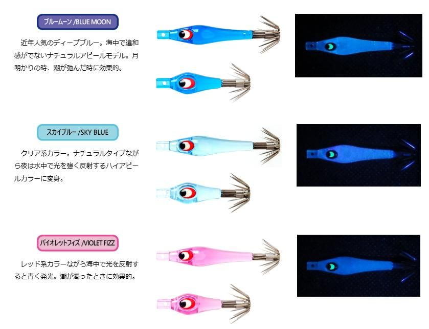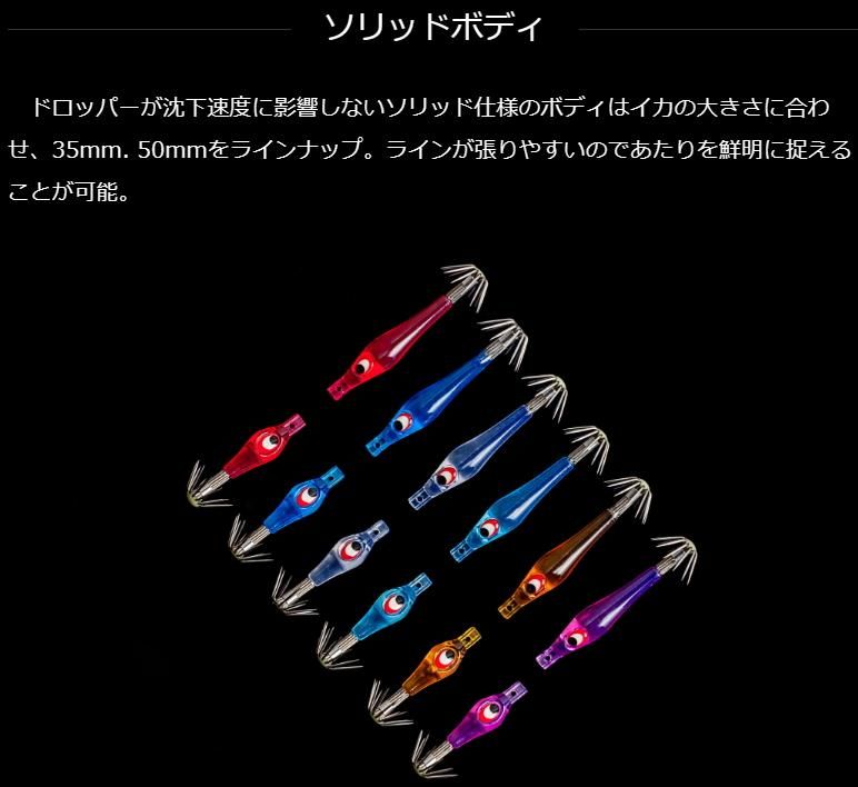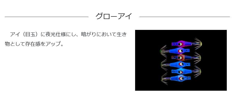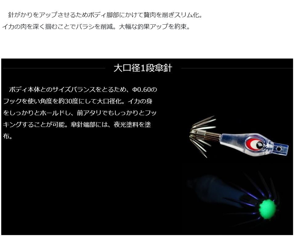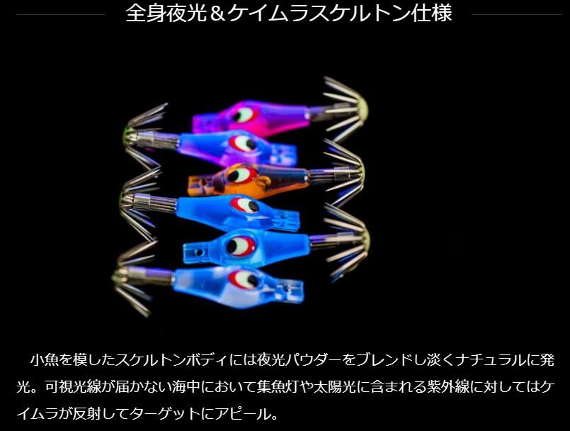 スリムボディシェイプを採用。スケルトンタイプのケイムラ&グローボディは水中で集魚灯や太陽光を拡散しイカにアピールします。