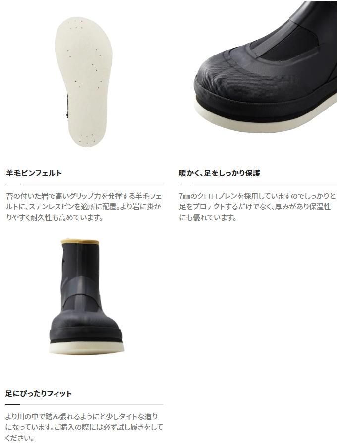 強化ゴムが入ったトーガードと7.0mmのクロロプレン、そして内側のパイル状ジャージが優れた保護性を発揮して足をしっかとガード。踏ん張りが効く中割れタイプで、羊毛ピンフェルトがしっかりとサポートします。内側ファスナーが付いているので脱ぎ履きも簡単。