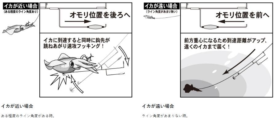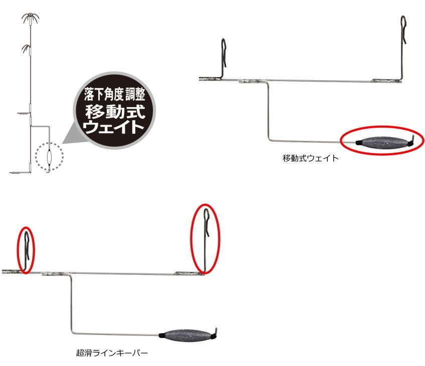 ついにヤエンの鈎に「ナノアルファ」を搭載!驚異的な掛かりを実現しました。オフセットされたオモリは重心を低くし滑走時のブレを防止、「ナノスムースコート」のラインキーパーと相まって滑らかに素早くヤエンが到達します。オモリは軸上移動でき、イカとの距離・糸の角度により最適に調整できます。