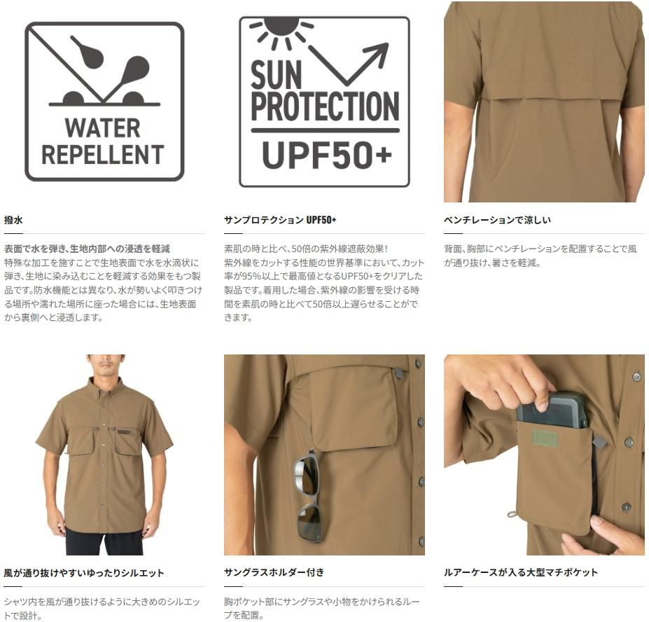 UPF50+の紫外線遮蔽率の高い素材で日差し対策をとり、リップ素材を採用することでドライな肌触りに。前ポケットには、脇〜背中にかけてベンチレーション機能を搭載することで蒸れにくくなっています。ポケットはルアーケースも入れられる少し大きめのサイズで、ループが付いているためサングラス等の小物を引っかけることも可能に。