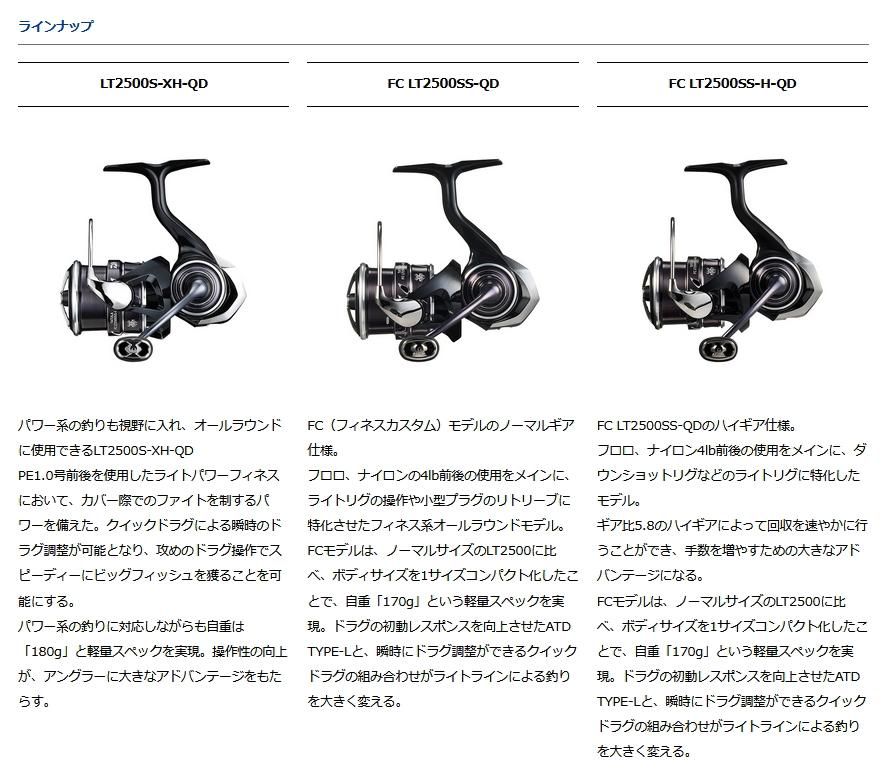 パワー系の釣りも視野に入れてオールラウンドに使用できるノーマルLT2500番と、フィネス性能の向上を狙って1サイズコンパクトなボディで開発したFC(フィネスカスタム)モデルをラインナップ。