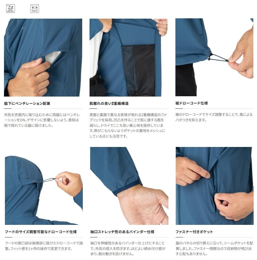 表面には撥水加工、肌面には凹凸のあるドライタッチ素材を使用した二重織構造。脇下にはベンチレーションを設け、左右ポケットはメッシュ素材がついた蒸れにくい仕様となっており着心地は快適。フードと裾のドローコードが、風でバタつかないよう調節可能に。朝晩の冷え込む時間帯にさっと羽織ることができ動きやすいので、キャスティングも問題なくできて幅広いシチュエーションで使える1枚です。