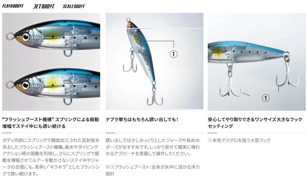 相模湾でキハダマグロを狙う上でシーズン前半のワンチャンスを逃さない飛距離。またハイシーズンのハミになった分厚いナブラでも、低浮力設計にすることでできるだけルアー全体を水に浸らせ、さらにフラッシュブーストが輝き続けることでステイ中にも途切れない強いアピール力。さらにシーズン後半に現れるビッグサイズでも安心してやり取りできるワンサイズ大きなフックセッティング。それらのマグロ狙いに必要な要素を全部盛り込んで開発しました。