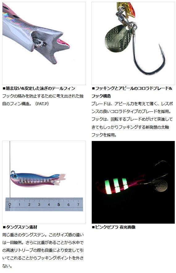 素材は、高比重タングステンボディ。マッチザベイトに加え、飛距離と動きの速い群れにいち早く到達させるためこの素材を採用。ブレードはコロラドタイプで大きな波動でアピールするとともに、カタクチなどメインベイトの泳ぎにアジャストさせることを意識したブレードタイプとして採用。
