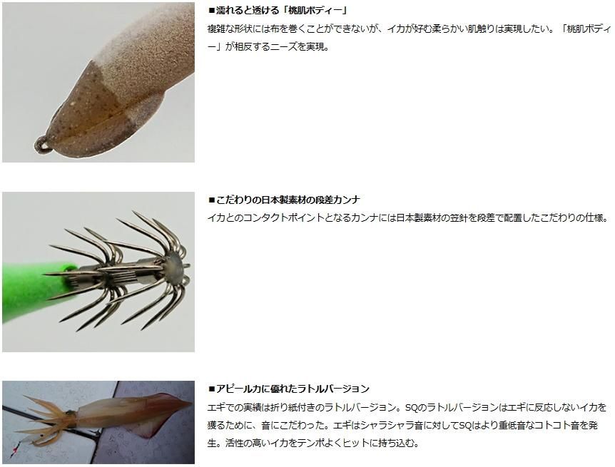 表面加工にもこだわり、濡れると透ける「桃肌ボディー」はイカが好む布ライクな肌触りに加え、濡れると下地が透けて浮き出てくる。