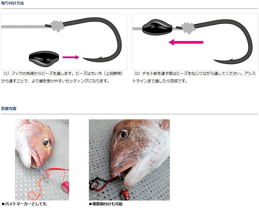 浮力性のある独自形状のビーズをアシストラインに取り付けることで、ビーズが潮を受けフックとネクタイが同調しやすくなり、フッキング性が向上。