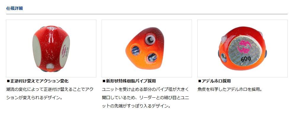 長きにわたり、タイラバを研究してきた結果たどり着いたタイラバヘッドの完成形。βシステムとの相乗効果でフッキング性能大幅UP。潮の速さに合わせて逆付け、正付けでアクションが変えられるダブルアクション設計。