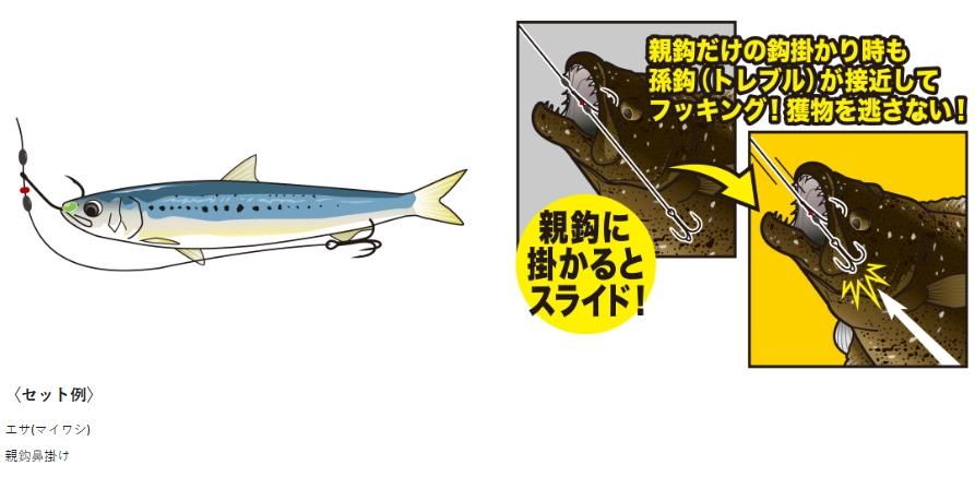 親鈎にヒラメが掛かると、孫鈎の方へスライド孫鈎のトレブルフックがガッチリとフォローし、バラシ激減