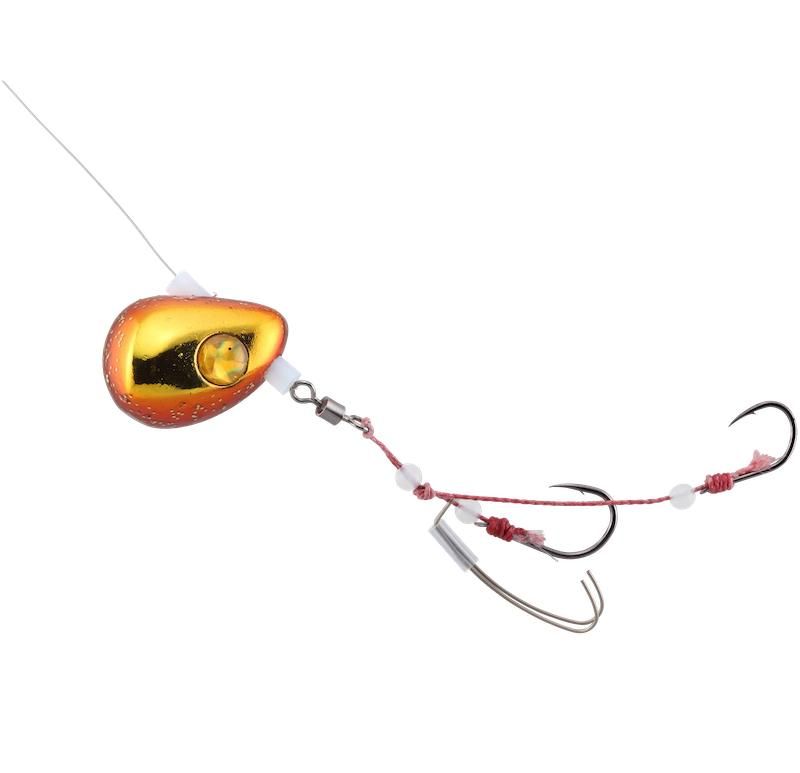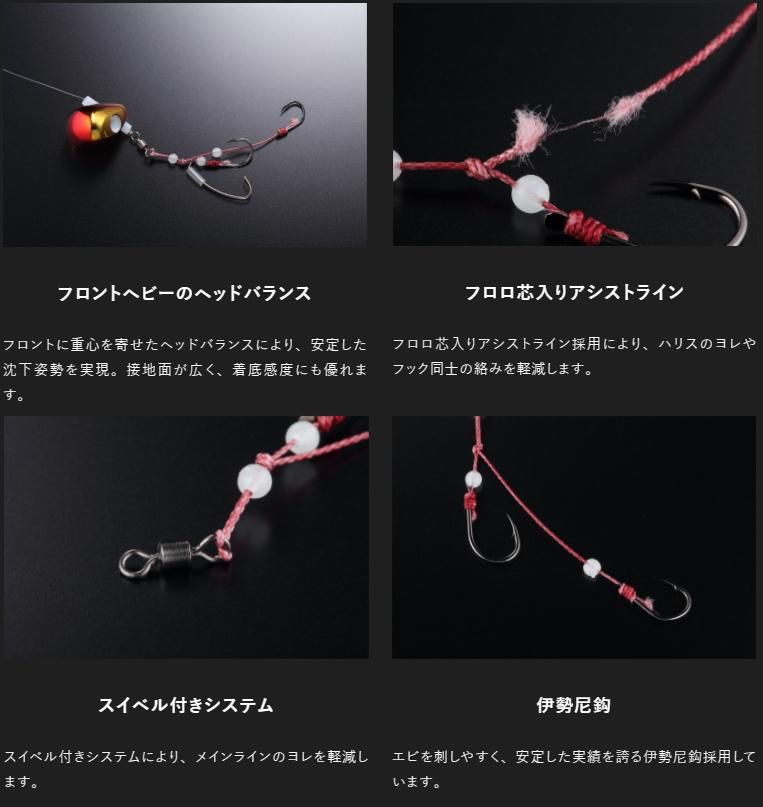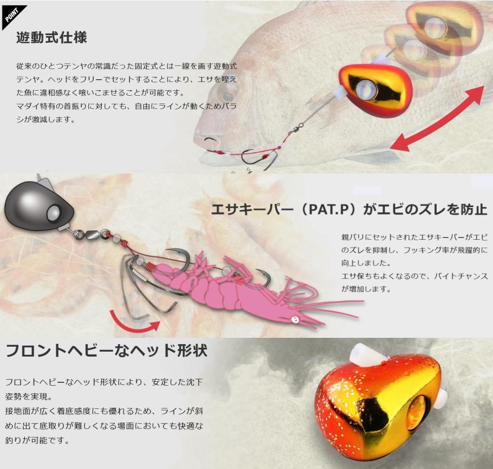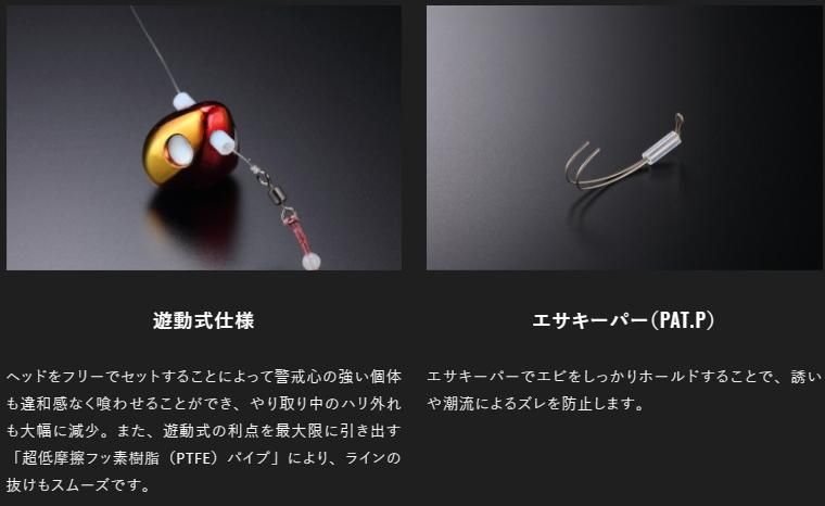 従来のひとつテンヤの常識だった固定式とは一線を画す遊動式テンヤ。ヘッドをフリーでセットすることにより、エサを咥えた魚に違和感なく喰いこませることが可能です。