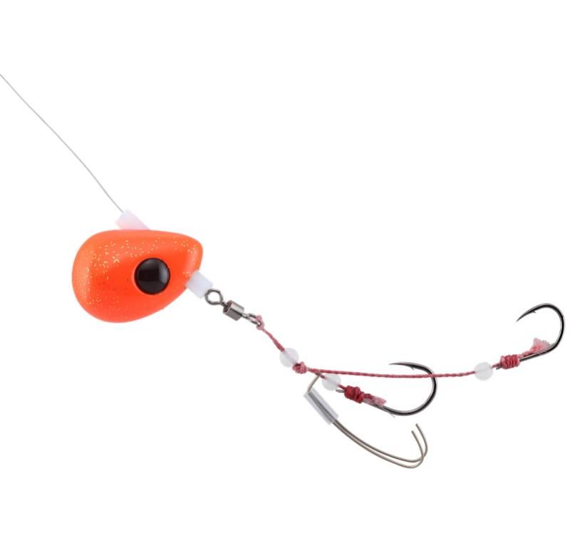 従来のひとつテンヤの常識だった固定式とは一線を画す遊動式テンヤ。ヘッドをフリーでセットすることにより、エサを咥えた魚に違和感なく喰いこませることが可能です。