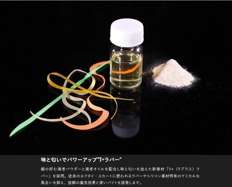 鯛の好む海老パウダーと海老オイルを配合し味と匂いを加えた新素材「T+(tasteプラス)ラバー」を採用。従来のネクタイ・スカートに使われるラバーやシリコン素材特有のケミカルな風合いを抑え、鯛ラバにじゃれついたり、小突くだけのアタリからしっかり食い込ませてフッキングに持ち込む「最後のひと押し」として抜群の集魚効果と深いバイトを誘発します。