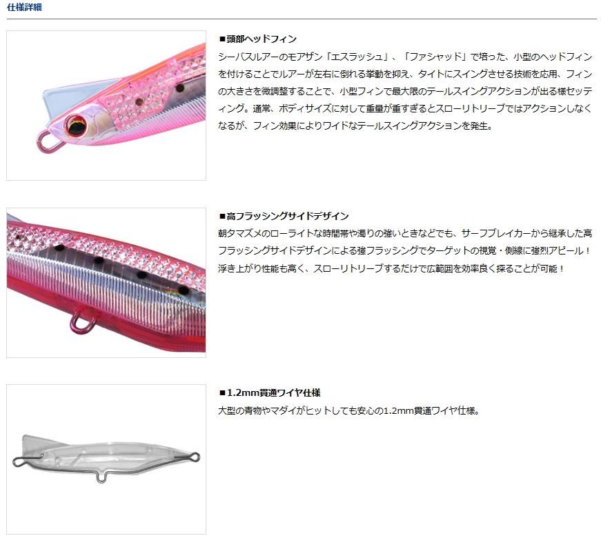 シーバスルアー「ファシャッド」で培った小型ヘッドフィンのノウハウを活用し、スローリトリーブでもワイドテールスイングアクションが出る様セッティング。