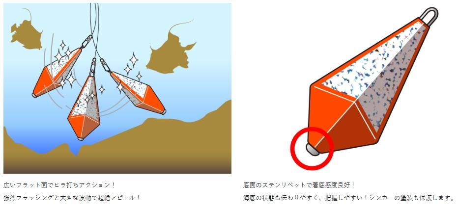 水切りの良いフォルムと大きなフラット面が、キレの良いヒラ打ちと強烈なフラッシング効果を生みだします。また、底部のステンレス・リベットが着底感度を増し、底質の感知能力も抜群です。