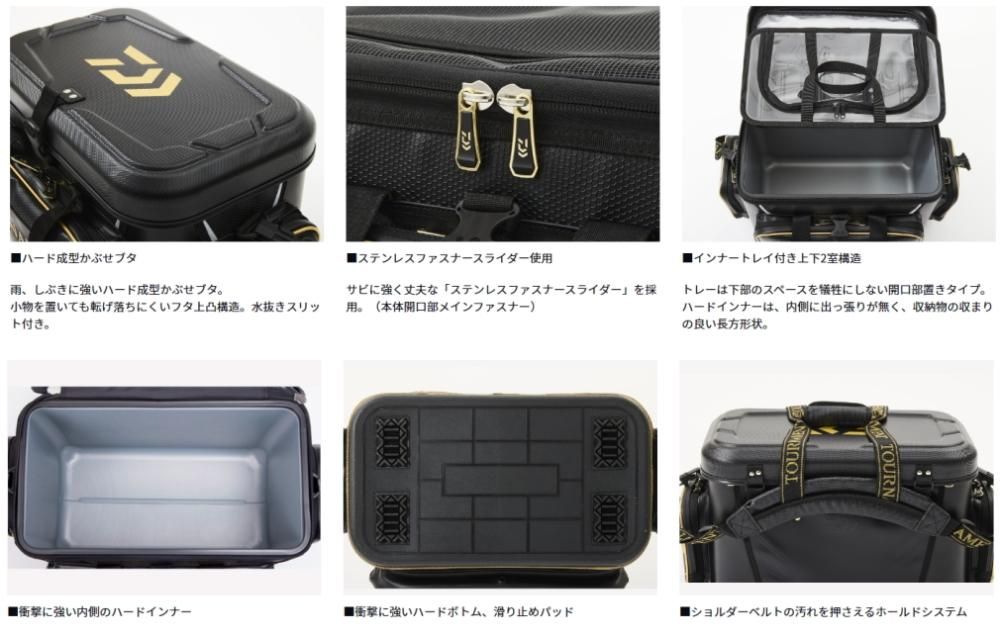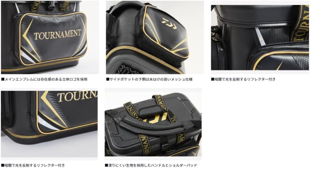 その他にも、磯渡し時等にも安心な4点支持ハンドル付き、肩にやさしい大型パッド付きショルダーベルト、ショルダーベルトの汚れを抑えるホールドシステム、水が浸透せず、お手入れの楽なPU・ABS表面素材、暗い時間でも光が当たると反射するリフレクター付き。