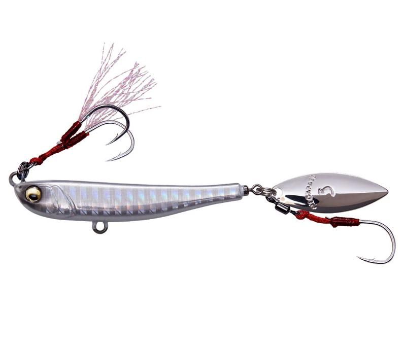 マキッパはその名の通り、投げて巻くだけの新感覚キャスティング・ブレードジグ。ソルトウォーターシーンにおいて、キャスティングジグは飛距離性能と多様な魚種に有効なことから定番のルアーとなっていますが、思い描いたアクションを出すのが難しかったり、狙ったレンジをキープしづらかったりと、使うには慣れや経験が必要なルアーといえます。マキッパは、キャスティングジグの使いにくさをカバーし、誰もが簡単に扱えるよう、徹底チューンを施しました。テールには巻くだけで集魚効果の高いブレードを装着し、さらにブレードの回転を阻害せずにブレードバイトを高確率でフックアップ可能な、ブレードフックシステム(PAT.)を搭載。計算されたボディバランスと各パーツの配置により、ボディが回転することなく安定したスイミング&フラッシングでターゲットを誘います。