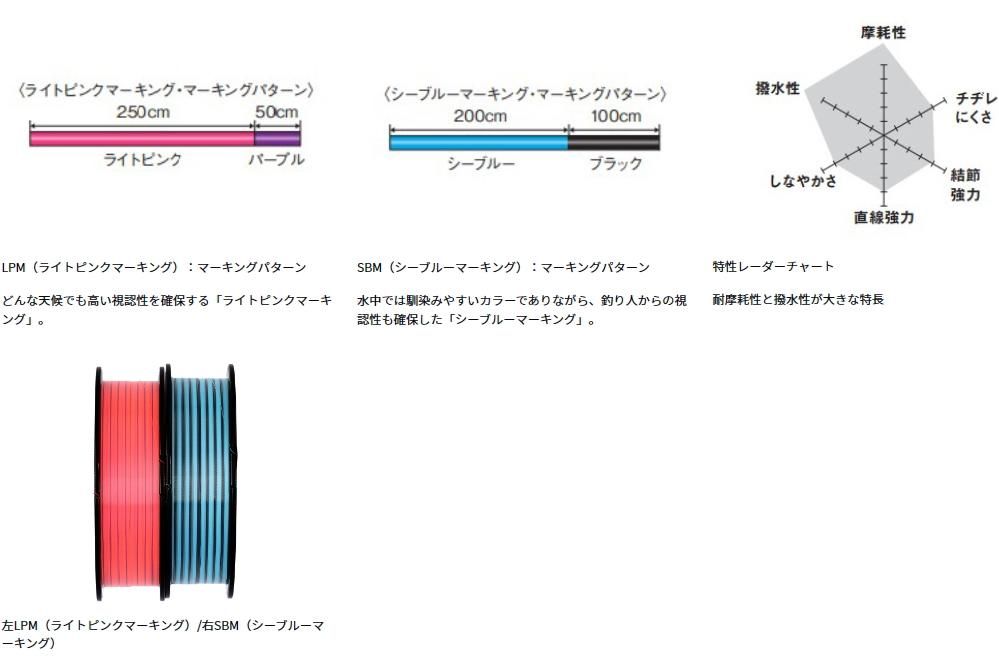 視認性については、特殊加工により、太陽光下での視認性が格段に向上。また、ラインの動きや仕掛け位置の把握が容易なライトピンクマーキング、水中では馴染みやすいカラーでありながら、釣り人からの視認性も確保したシーブルーカラーマーキング、と視認性重視の明るいカラー+マーキング仕様に。