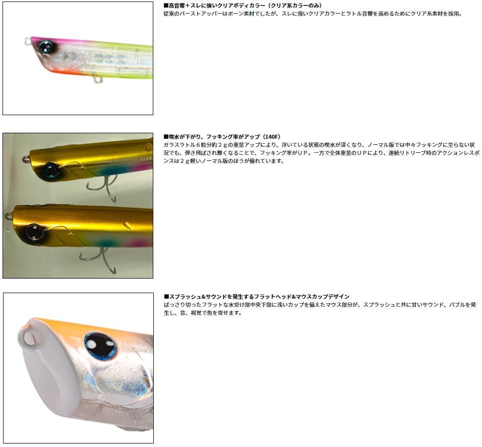 ただ巻きをするだけで斜めに切ったヘッドが水を受け水を左右にかき分けてヘッドを振り、水面や流速の変化で不規則にダイブ&スプラッシュする攻撃型アピール系ルアー。十分な飛距離と立ち上がり性を両立させた重心移動システム塔載。小沼正弥監修。