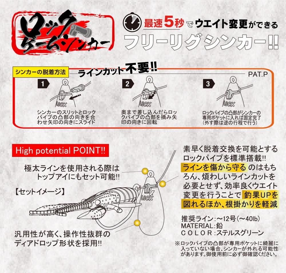 素早く脱着交換を可能とするロックパイプを標準搭載!!ラインを傷から守るのはもちろん、煩わしいラインカットを必要とせず、効率良くウエイト変更を行うことで釣果upを図れるほか、根掛かり軽減。