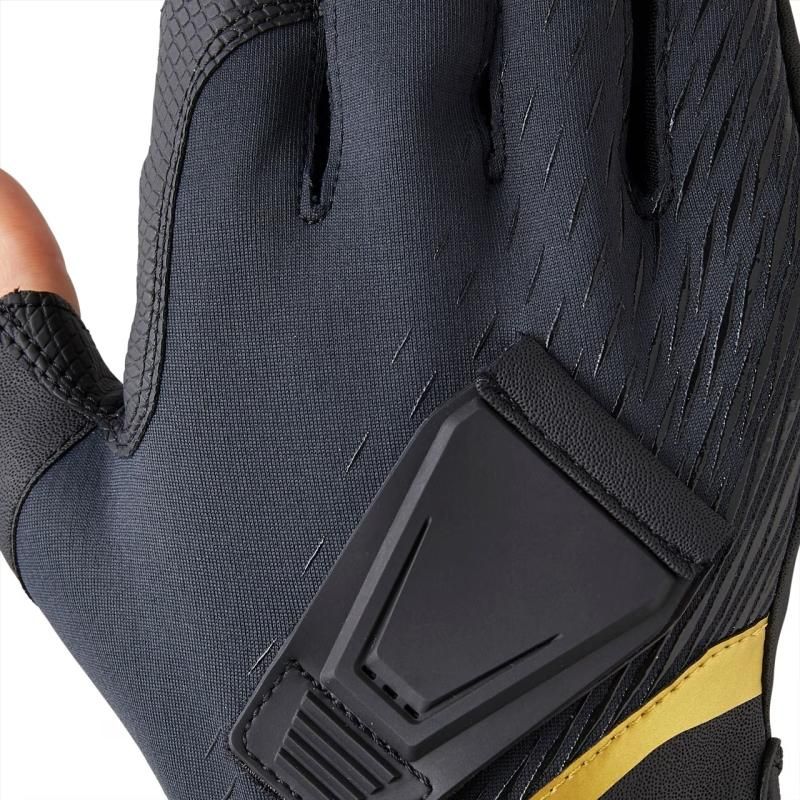 手の甲に防風性のある生地を採用した磯用グローブです。ハリスを滑らせ針を掴む動作を想定してレザーの配置を見直し、さらに針を収納できるマグネットホルダーを搭載させました。操作性と保温性のバランスのよい3本指抜きタイプです。