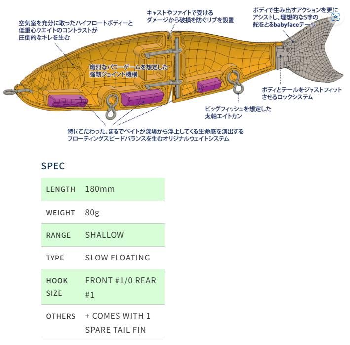 ジョイント機構の強度、8カン、フックサイズともに世界のフィールドで戦えるスペックのものを搭載。 操作のスイートスポットが広く、⼩さい⼊⼒で動き出し、⼤⼊⼒への耐性も⾼い。アクションは、綺麗なS字スイミングだけでなく、不⽤意に⼤きくバランスを崩すことなく、リールハンドルの回転でバイトチャンスを作りやすいハイバランス設計。
