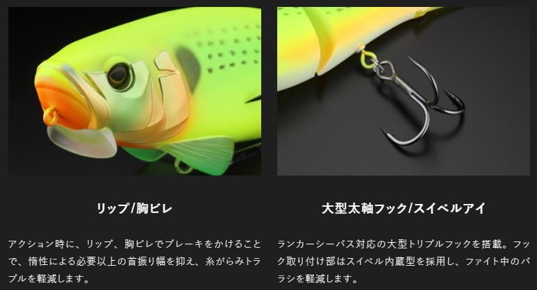 コノシロパターンに代表される対ランカーシーバス用モデル。全長220mmのボディによる超ハイアピールアクションで本能を強烈に刺激します。