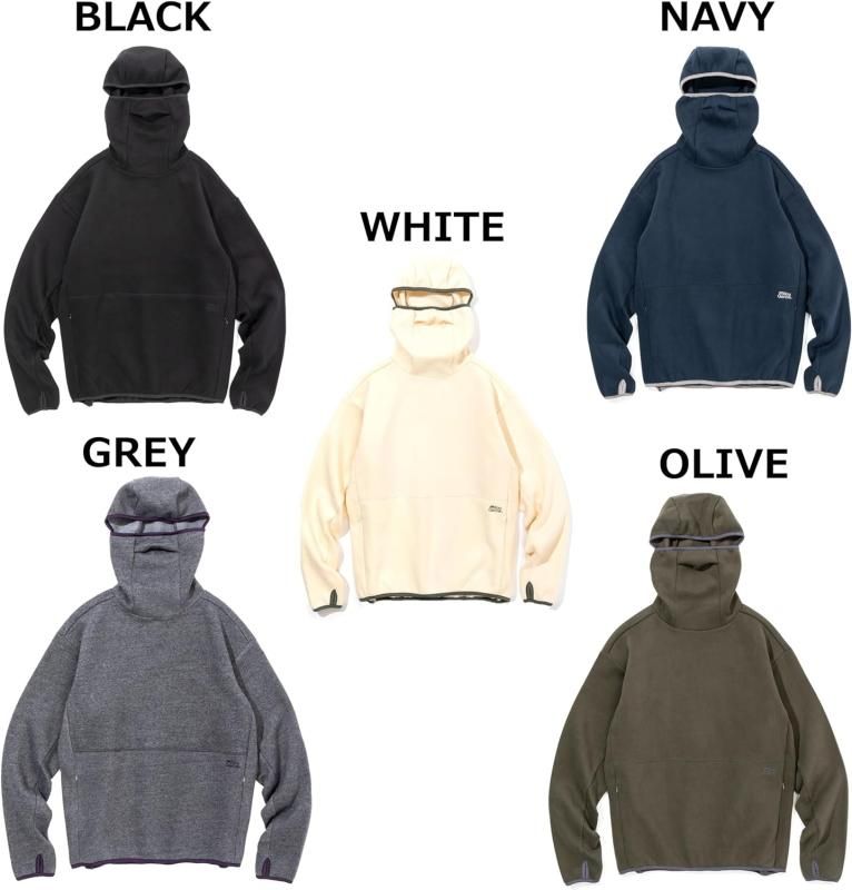 ・ポリエステルベースにコットンを混紡した裏起毛素材使用のバラクラバ一体型フーディー。