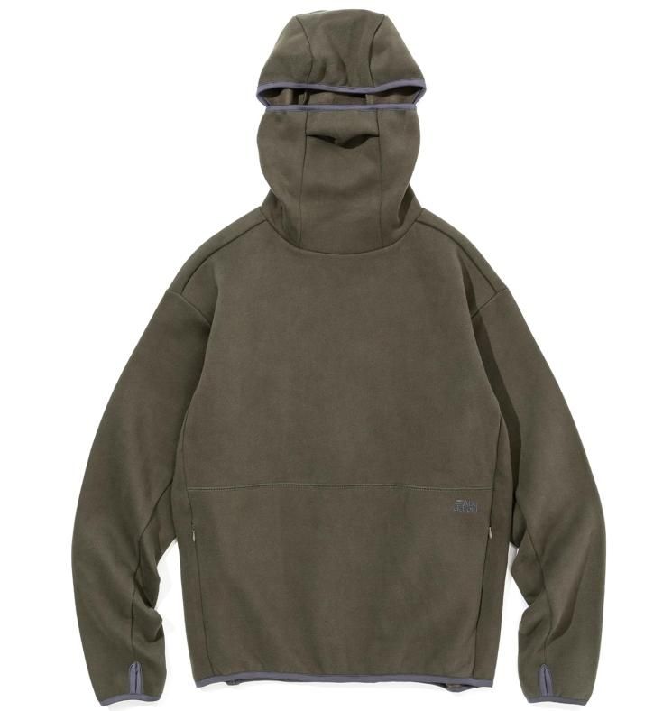 ・ポリエステルベースにコットンを混紡した裏起毛素材使用のバラクラバ一体型フーディー。