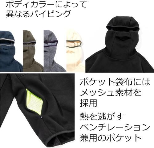 ・ポリエステルベースにコットンを混紡した裏起毛素材使用のバラクラバ一体型フーディー。