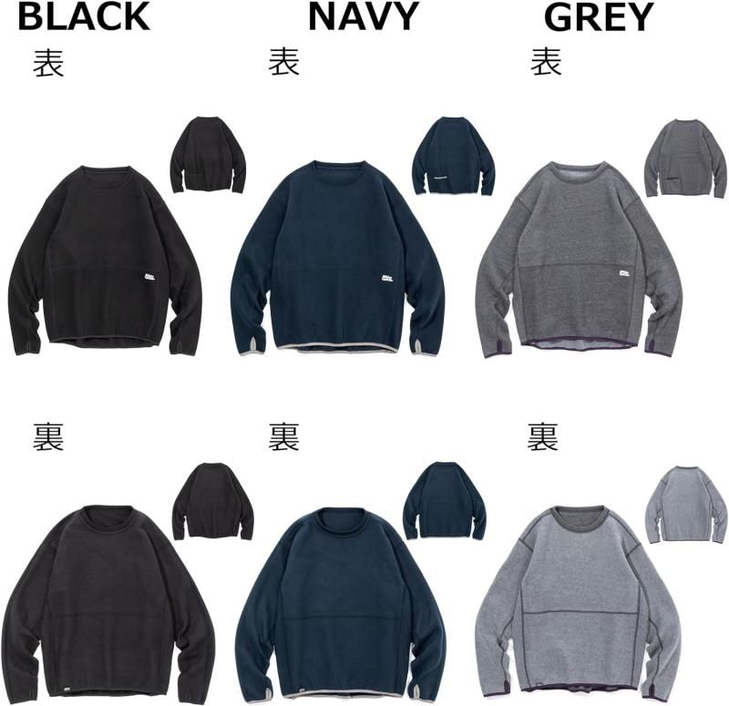 ・ポリエステルベースにコットンを混紡した裏起毛素材を使用したリバーシブル仕立てのクルーネック。