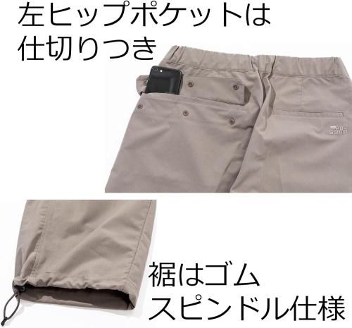 ・タウンでもアウトドアフィールドでも着用できるアイテム。脇線のパターンを調整し、ヒップ側にゆとりを持たせることで脚の可動域が広がり、立ち座わり動作にストレスが少なく、左腰部にスマートフォン用のポケットを追加し、座り時に座面に当たらないよう設計しています。