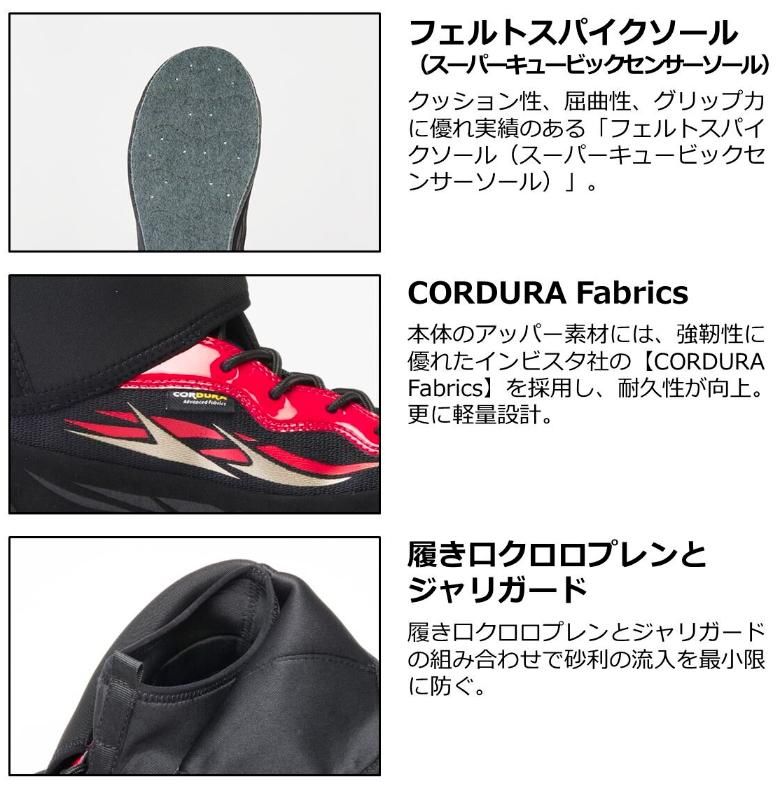 ソールはクッション性、屈曲性、グリップ力に優れた一体式スーパーキュービックセンサーソール仕様。一体式のため、屈曲性能、グリップ力が更に向上。